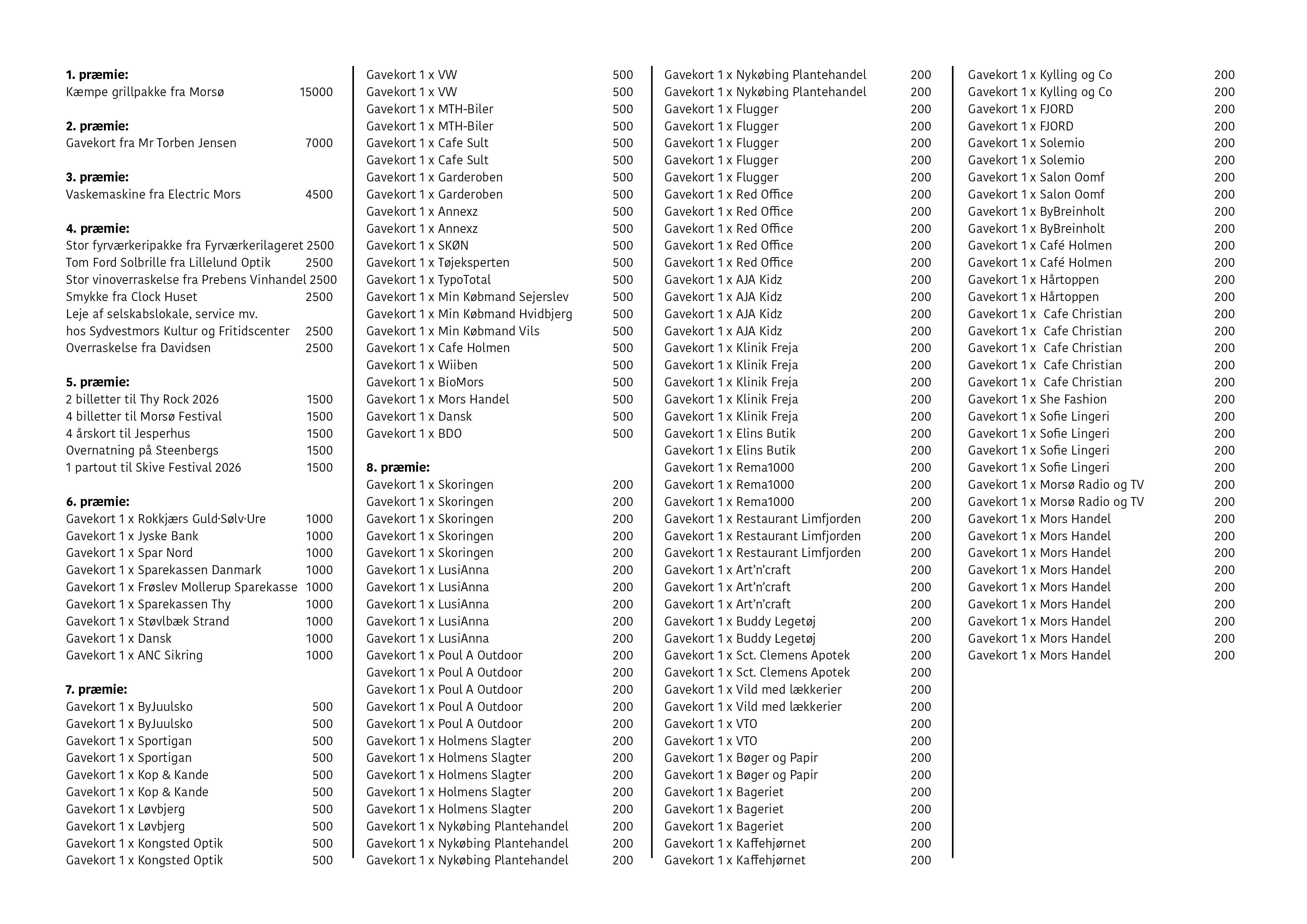 Samlet oversigt over præmierne: